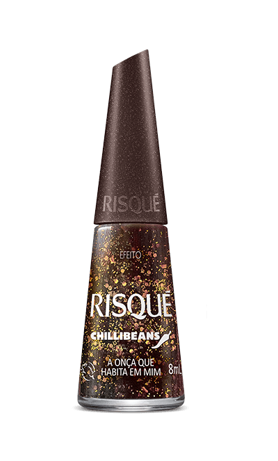 O esmalte A Onça que Habita em Mim da coleção Risqué & Chilli Beans Colorindo Seus Instintos é um marrom com glitter dourado e possui acabamento de efeito, secagem rápida e ultra brilho, além de ter longa duração nas unhas. Todos os esmaltes são cruelty-free e com fórmula hipoalergênica. Conheça a nova coleção Risqué & Chilli Beans com esmaltes, óculos e relógios exclusivos cocriados nos mínimos detalhes para você colorir seus instintos!